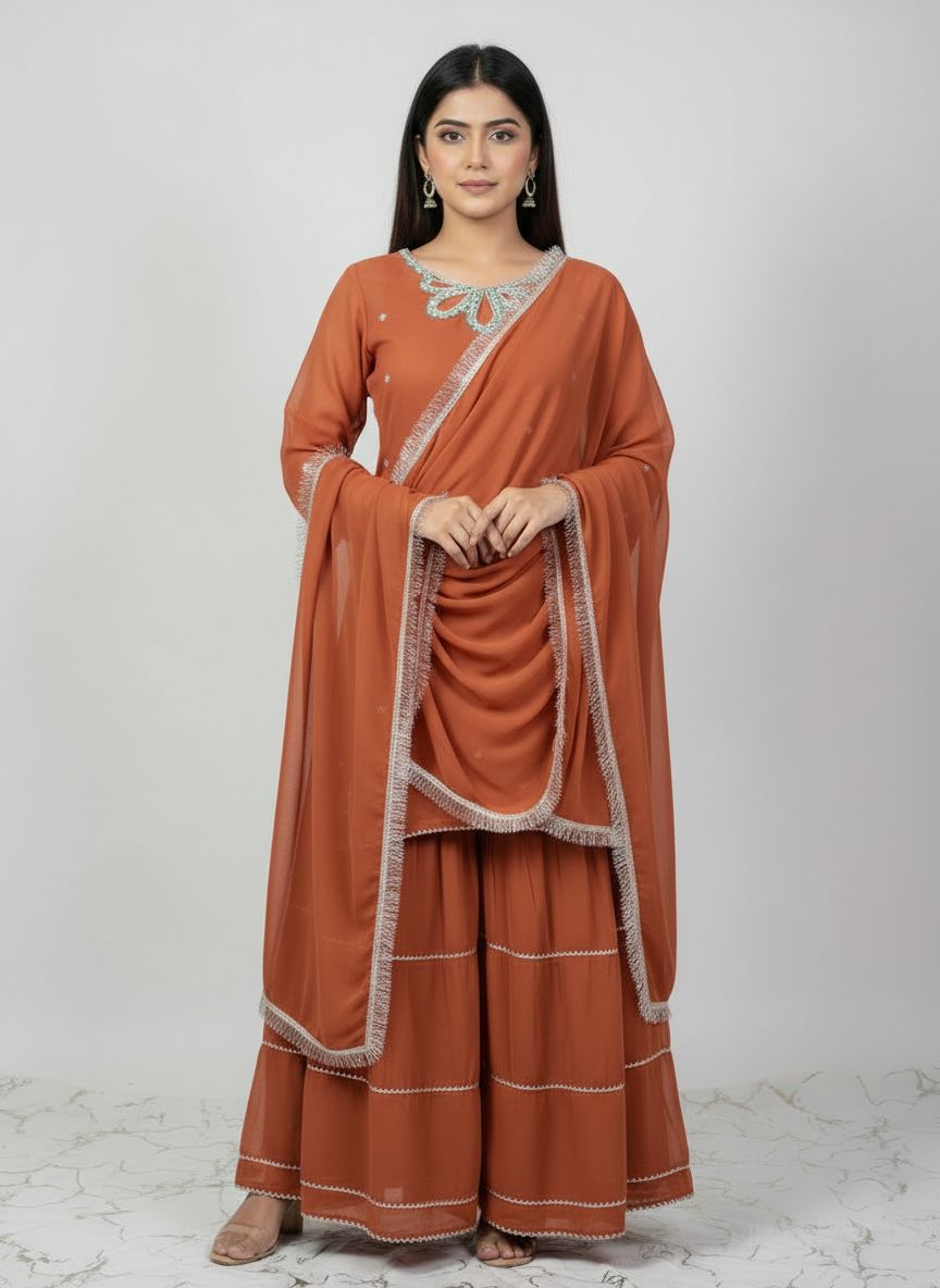 Step into elegance with the Pearl Elegance Kurti, beautifully adorned with delicate pearl work on the neckline. The refined detailing at the hemline with three-piece accents adds a touch of modern charm, making it a perfect blend of sophistication and style. Ideal for both casual gatherings and festive occasions.